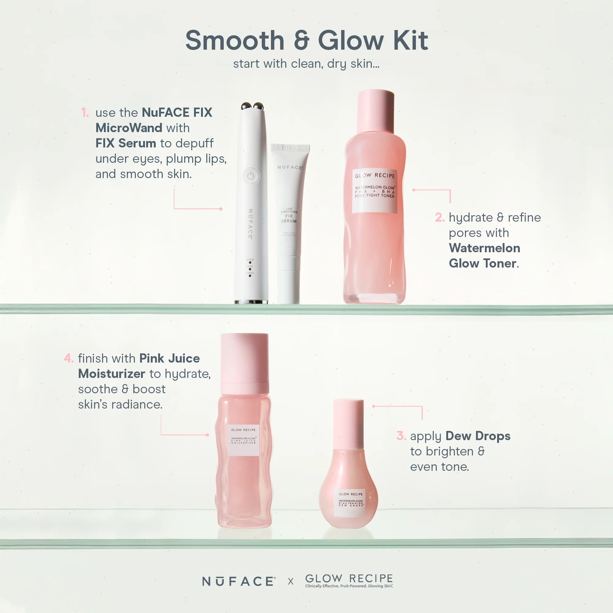 Meet the Glow Recipe X NuFACE Smooth & Glow Kit: a five-step ritual that combines the best of Glow Recipe’s Korean skincare innovations with NuFACE’s precision microcurrent technology. Start with the FIX MicroWand to smooth lines, depuff under eyes, and plump lips with gentle microcurrent. Then follow with Glow Recipe’s glow-boosting essentials to deeply hydrate, refine pores, and visibility brighten skin to deliver that effortless glass-skin glow.